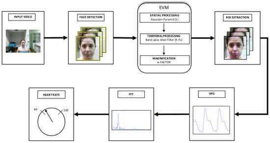 The proposed method for the estimation of HR takes as input RGB frames of a human face. The area related to the human face is detected and processed by the EVM algorithm [17], which enhances the small changes in luminance due to blood flow. Then, limited areas of the face and neck are selected through an ROI extraction step. Finally, the main frequency component of the VPG signal within the ROI is computed by FFT, and the HR value is the output of the system. The main scheme of the method is shown in Figure 1, where the different steps can be identified.