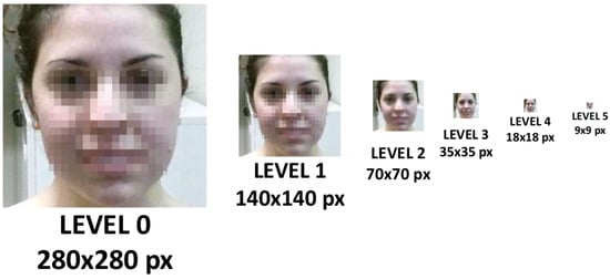 The following EVM processing encompasses three steps, i.e., spatial and temporal processing, together with a signal magnification. Spatial processing consists of the decomposition of the frames with a Gaussian pyramid, considering a number of predefined levels L. The Gaussian pyramid is created from each image featuring the human face, including the neck, by blurring and downsampling it into various levels. In fact, the spatial pyramid is a set of layers in which the image is downsampled so that the higher layer has a smaller size, as can be noticed from Figure 2.