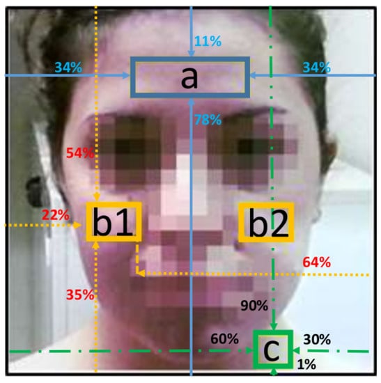 Selected regions of interest: (a) Forehead (F); (b1,b2) Cheeks (C); (c) Neck (N). Some details are blurred to preserve the subject’s privacy. The ROIs are selected considering the percentage of the detected face area shown in the figure.