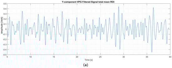 VPG signal (Y-component) obtained by averaging the signals of all of the ROIs (F, C, N or, rather, ROI T (Total)) over one test execution. The signal is represented in the time domain (a) and in the frequency domain (b), after the bandpass filtering process.