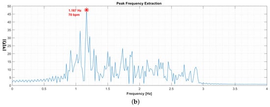 After the extraction of the VPG signal in the time domain, as shown in Figure 4a, and its transformation in the frequency domain, through the application of FFT, take place, the idea is to extract the frequency component of the VPG signal that is dominant in a specific band, which is related to the blood circulation and thus to the HR. A Butterworth bandpass filter is applied to select the band of interest, and a spectral analysis is performed to extract the main frequency component, as can be noticed from Figure 4b. Finally, since the HR is expressed in beats per minute (bpm), the final operation is the straightforward conversion of the dominant frequency component into the bpm scale.