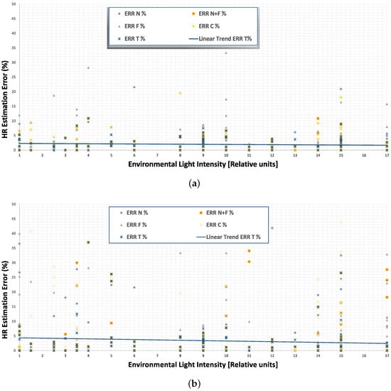 The relation between HR estimation error and the environmental light conditions has been also investigated for the system based on RGB data from Kinect, and the results are summarized in Figure 6a,b, respectively, for the supervised and unsupervised approaches.