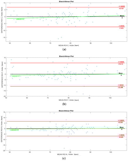 Bland–Altman plot, correlation between HR values extracted by the Holter and through the proposed method in: (a) ROI C; (b) ROI F; (c) ROI N.