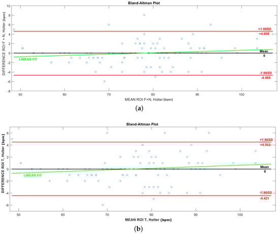 Best correlation values with the Bland–Altman plot, between HR values extracted by the Holter and through the proposed method in (a) ROI F + N; (b) ROI T.