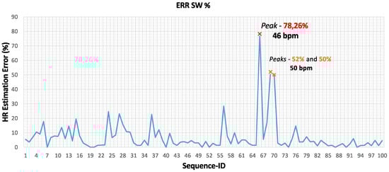 Figure 9 shows the error values provided by the smartwatch and the gold-standard. The smartwatch features a large error at Sequence-ID 66, which is associated with an athlete with an HR of 46 bpm. It can be observed that the HR estimation error is greater than only in three sequences featuring an HR value lower than 50 bmp.