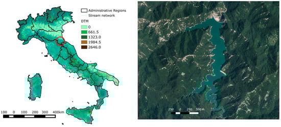Figure 1. DTM of Italy (left panel), the red circle indicates the case study area, while the dam case study i.e., the Ridracoli dam and the Ridracoli lake are on the right panel.