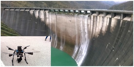 In this framework, monitoring operations and vulnerability assessment of dams plays a crucial role in preventing catastrophes and thus safeguarding human lives. Because of the large dimensions and the low accessibility of dams, a unique opportunity for monitoring is offered by Unmanned Aerial Vehicle (UAV) systems. Indeed, UAVs are extremely advantageous for visual investigation of large-scale structures such as dams and retention walls [9]. The use of UAVs has acquired a key role because of their fast and low cost operations and of the possibility of reaching places that are otherwise difficult or impossible to access directly [10,11,12]. UAV surveys find applications in several fields, for instance UAVs are used for vegetation monitoring [13], precision agriculture enhancement [14], and information acquisition concerning damages caused by natural disasters such as earthquakes [15,16]. In hydrology, drones are used to measure open channel surface velocities [17,18].