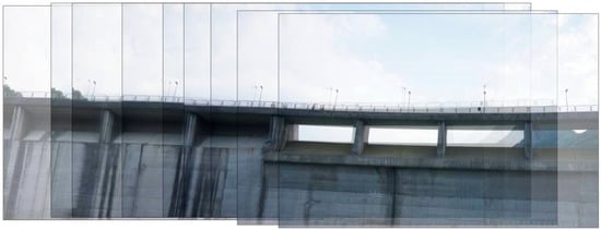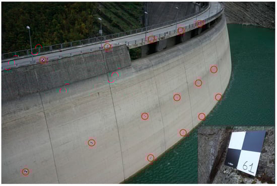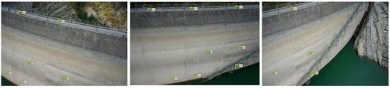 In two different moments of the year, sixty regularly-spaced markers were placed on three rows on the upstream face (Figure 3). In August 2015, two rows of markers were applied on the crest railing and on the upstream surface at the hydrostatic level of the time (i.e., 543.28 m a.s.l.) using a boat. While in October 2015 a third row of markers was deployed at the new hydrostatic level (i.e., 533.65 m a.s.l.). The UAV survey of the upstream face was performed after this last marker deployment to ensure uniform shooting conditions of the frames [65]. The image size is 7360 × 4912 pixels with a resolution of 350 dpi. The images were shot at a distance of about 15 m from the dam; the Ground Sample Distance (GSD) equals 2.1 mm. The images are shot every 1.87 s and the images overlap by more than 70%. An example is provided in Figure 4.