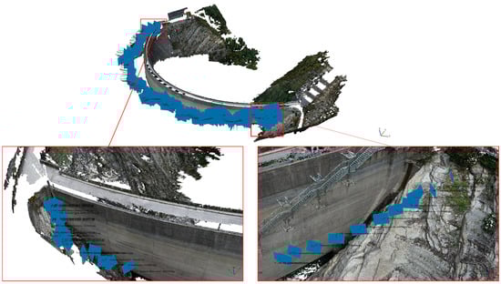 The frames acquired by UAV are used to build a 3D dense point cloud model of the upstream face through the Structure from Motion (SfM) technique (Figure 7). The SfM technique allows the construction of a three-dimensional dense point cloud model of an object starting from the automatic collimation of frames [33]. At first, the procedure consists in performing a feature point detection and matching, using automatic algorithms. Then, incrementally, this procedure adds images, triangulates matching features and refines the scene using bundle adjustment, allowing for the construction of the 3D point cloud. The Agisoft Photoscan® (vers. 1.2.4) software was employed to build the 3D dense point cloud. To derive the dense point cloud, the procedure is presented in the study by Jaud et al. [66].