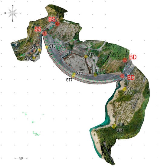 The coordinates of the markers were acquired through a traditional survey technique using a Total Station TS30 (Leica-Geosystems). To this end, a pre-existing geodetic network was used for monitoring purposes. The existing network consists of four vertices materialized by little pillars (i.e., BS, SS, DS and BD, Figure 6). Besides the existing network, a new one was setup with 7 vertices materialized by topographic nails fixed on the ground (Figure 6). The new network was connected to the first one through topographic triangulation measurements.