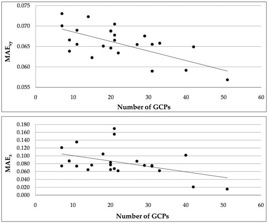 Figure 8. Mean Absolute Error (MAE) on the North-East plane and along the elevation (i.e., z direction) against the number of Ground Control Points (GCPs).
