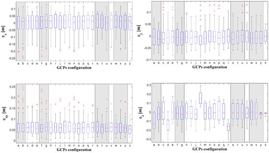 Figure 9. Boxplots of errors (ε) along North, East, elevation (y, x and z) directions and on the North-East plane for each GCPs layout. The background colour groups layout with the same density as in Table 1.