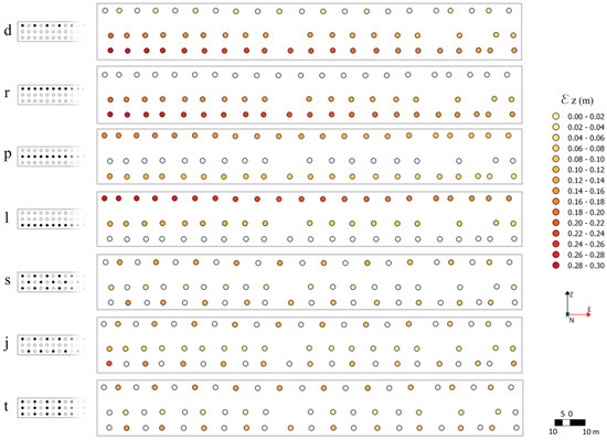 The MAE values on the North-East plane lead to the same conclusions (Figure 9, lower left panel). Indeed, the configuration z has the lowest value in this direction, as it does along the elevation. It is followed by the configuration t, in which the GCPs are placed on the three rows in every other position, ensuring a good coverage of all the upstream face.