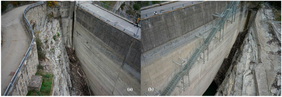 The boundaries of the dam are among the most important parts of the dam since they define the connections between the structure and the surrounding terrain. However, because of the shape of both right and left abutments, dam boundaries are not easily accessible by drone survey (Figure 12a,b).