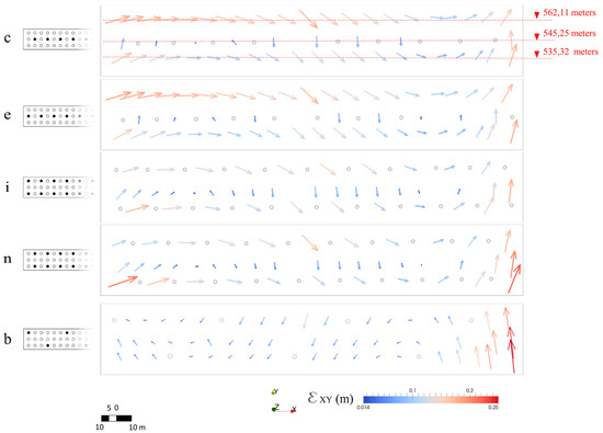 Figure 13. Error along the North-East plane (εXY) for each CP for GCPs configurations c, e, i, n, b. The placement of the arrows (indicating the error magnitude and direction) and of the grey circle is in accordance with the location of the GCPs—positioned at different levels on the dam upstream face—to facilitate the reading of the data. In particular, the figure on the top shows the altitude (meters above sea level) of the location of the GCPs.