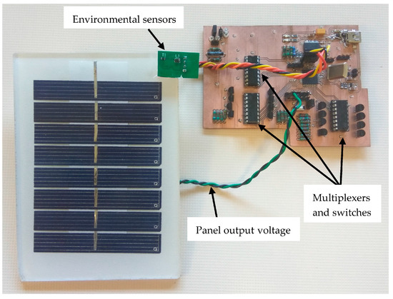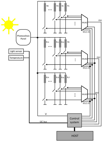 Their overall real values have been measured using a Keysight (Santa Rosa, CA, USA) 34410A 6 ½ digital multimeter (DMM) using four-wire technique. In this way, the accurate knowledge of the resistor values allows estimate the value of the power transferred to the load at a certain voltage without requiring the current measurement, simplifying the data acquisition. The operation of this module is controlled by a low-cost microcontroller that selects the panel load and reads the measurements, locally storing the values before being sent to a host system for its processing.