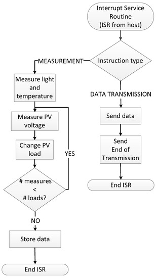 The control and acquisition system is designed to be controlled by an external host. Before its deployment, a first characterization can be performed using a computer as host system, though after placement in its definitive location the system is designed to be managed by the sensor node where it is connected. Figure 3 shows the dataflow implemented in the microcontroller. First, the microcontroller configures its peripherals and initializes variables, next going to a low-power state until the host device sends an interrupt request through the serial port. The first interrupt commands the microcontroller to run the measurement process, which starts acquiring temperature and illuminance. Next, the panel output voltage measurements are taken, consecutively selecting the 24 resistors in the variable load. Considering switching, voltage settling time and ADC conversion time using the microcontroller at a 24 MHz working frequency this process takes less than 20 ms, so that both temperature and illuminance can be considered constant along the measurement process.