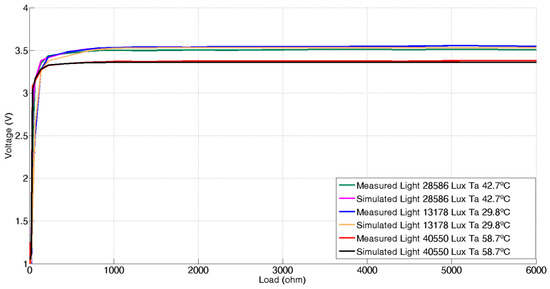 Real and simulated voltage-to-load curves at three different light and temperature conditions.
