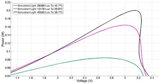 Once verified the correct fitting, the MLP has been tested to obtain the power-voltage curves that characterize the behaviour of a solar panel. For this, the environmental MLP model inputs (illuminance and temperature) are fixed at the desired values, sweeping the range of the ANN input that represents the panel load to obtain the voltage values from the ANN output. Power is calculated as the output voltage over the corresponding input load value. Figure 7 shows the obtained results. Note that in this modelling, the voltage shows a coupled dependence with illuminance and temperature. This is because, unlike the models developed in laboratory, where temperature and irradiance can be independently controlled, the experimental models based on in-situ environmental measurements account for coupling in temperature and illuminance (i.e., the more illuminance, the more temperature). Therefore, these simpler models are not general, but locally valid and suitable for its use in the proposed application: the development of a solar energy harvesting system based on a local behavioural model to control the maximum power point tracking.