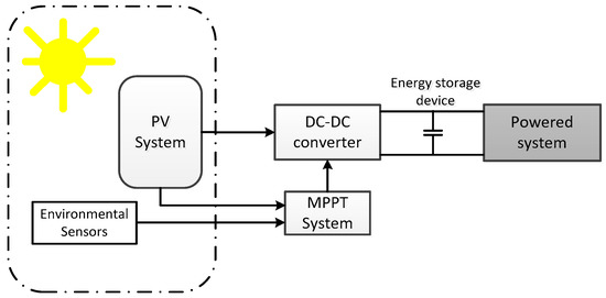 Figure 8 shows the block diagram of a typical solar-based energy harvesting system. A photovoltaic device converts solar to electrical energy. The direct-current-to-direct-current (DC-DC) converter generates from the PV device a stabilized voltage, that feds the powered system, comprising an energy storage system (battery, supercapacitor), and the electronic system itself. A maximum power transfer circuit (called maximum power point tracking system, MPPT) tracks environmental and electrical magnitudes from the PV system, and modifies in real time the DC-DC architecture to keep an optimum energy transfer. The monitored variables are selected according to the implemented MPPT technique.