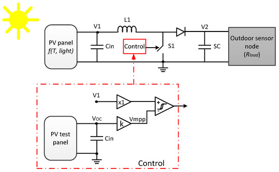 In the dual panel VOC technique (Figure 9), the control system monitors the open-circuit voltage in the reference PV panel (Voc), estimating the maximum power transfer voltage Vmpp (Equation (1)), which is compared to the working PV panel voltage V1. When V1 is lower than Vmpp, the switch S1 is turned off, increasing the load impedance, and thus increasing V1. Otherwise, if V1 > Vmpp, the switch is on, reducing the load impedance. To avoid fast and continuous changes in the switch state, the comparator module presents hysteresis.