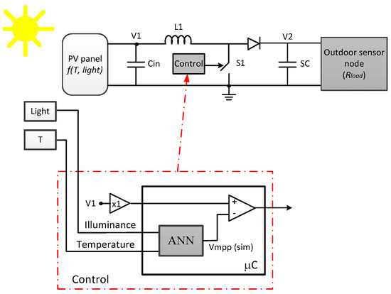 Figure 16 shows the electronic implementation of the energy harvesting system based on the VOC technique with ANN-based panel modelling. Temperature and illuminance are monitored by the microcontroller (located at the characterization system on top of the figure), that compares the real panel output voltage (sent from the DC-DC system to the microcontroller through the voltage tracking wires), and the ANN-based maximum power point voltage estimation (from temperature and illuminance real time values) to properly switch the value of the Control line of the boost DC-DC converter (centre, bottom). An additional line (in parallel to the Control line in Figure 16) disables the DC-DC circuit to operate the characterization system when it is required. Load tests were performed using one supercap to speed up the comparison process, though a wireless sensor node can require several in parallel [20] for suitable energy storage.