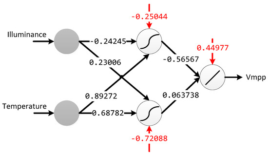 Multilayer perceptron weight values obtained to modelling the solar panel behavior. Red values correspond to bias weights.