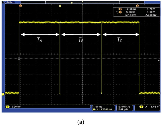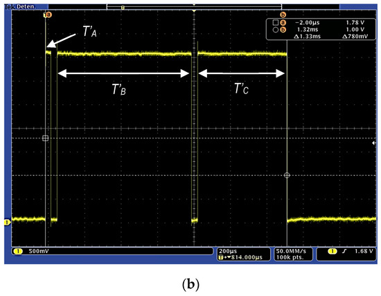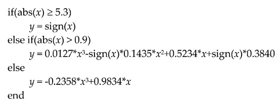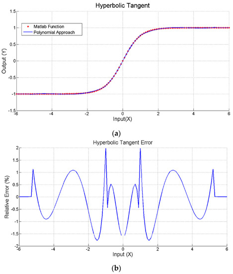And that has been implemented minimizing the operations, as shown in Figure 12, to reduce the computing time. The accuracy of this polynomial approach is shown in Figure 13. Left side shows the representation of a tanh(x) computed by Matlab running on a personal computer overlapped to the proposed polynomial approach in Figure 12 implemented on the used microcontroller. Right side in Figure 13 presents the relative error of this approach, which is lower than 2% (except in the zero crossing). Finally, the execution time has been experimentally estimated and compared to the time required for computing the tanh(x), using the standard C mathematical library. Both operations have been implemented in the microcontroller, measuring the execution time switching an output pin from logical ‘1’ to logical ‘0’. Figure 14 shows the operation time using the tanh(x) (a) and polynomial approach (b) for three different input values, corresponding to the input ranges shown in Figure 12. The tanh(x) function requires a constant time to perform each of the three operations ( = = = 2.4 ms), while the polynomial implementation requires a variable time of = 740 μs (worst case, second if(.) in Figure 12), = 500 μs (else condition) and = 33 μs (best case, first if(.)), always improving the execution time.