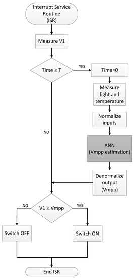 Figure 15 shows the flow diagram of the VOC MPPT routine with ANN modelling of the PV panel. The Control block microcontroller enters every time t in the interrupt routine. If the time after the last Vmpp estimation is higher than a set time T (>t), the system updates its value by computing the new Vmpp from the ANN model using current illuminance and temperature readings. Next, if the voltage V1 at the panel output is higher than the Vmpp, the control switch is turn on reducing the input impedance and, hence, reducing the voltage V1. Otherwise, the switch turns off.