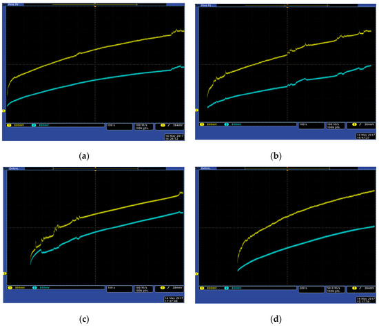 Charge curves for a 1.5 F supercap for a VOC algorithm using a reference panel (blue) and the ANN-based solar panel model (yellow). Environmental conditions (irradiance and temperature, average): (a) 850 W/m2, 35 °C; (b) 1300 W/ m2, 55 °C; (c) 1120 W/ m2, 43 °C; (d) 500 W/ m2, 26 °C.
