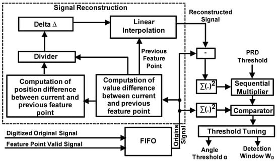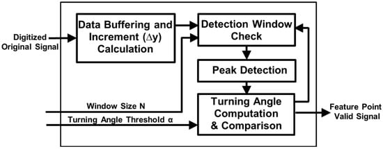 The architecture of the proposed compression engine is shown in Figure 2. We assume that the input signal has been smoothed and digitized by analog frontend and ADC (analogue-to-digital converter). A window-based turning angle detection module is designed to extract the feature points for signal compression. After the extraction, the values of the feature points and their interval will be recorded and wirelessly transmitted for later signal reconstruction and diagnosis. An adaptive threshold tuning module is designed to adjust the turning angle threshold according to the computed error between the original input signal and reconstructed signal using the feature points. The details of the proposed biomedical processing engine are described in the following subsections.