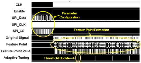 The proposed design has been implemented in a 0.18 µm CMOS technology. Figure 6 shows the layout of the design. In this study, the proposed biomedical signal compression engine was applied to ECG compression for demonstration. The input is a digitized ECG signal with baseline drift and noise from MIT-BIH arrhythmia database. The output data (i.e., the 16-bit feature point values and the 5-bit interval values) are recorded from post-layout simulation and used for signal reconstruction in MATLAB. Figure 7 shows the operation waveforms captured from the post-layout simulation. After the reset, the parameters of the compression engine—such as angle threshold, target PRD, sampling frequency, and adaptive tuning frequency—are configured through a SPI (serial-to-parallel interface) interface. Then the compression engine is enabled to sample data from external database at 360 Hz. Window-based turning angle detection is performed for feature point extraction. The angle threshold is updated at 200 Hz through adaptive threshold tuning.