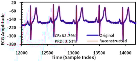We take the dataset 117 from MIT-BIH ECG database (commonly used for ECG signal compression research) as an example, the original and the reconstructed waveforms of the ECG signal are shown in Figure 8. Here the adaptive threshold tuning is disabled. For the No. 117 record, a CR of 82.79% is achieved which will lead to proportional power reduction in the wireless transmission. The PRD achieved is 3.53% which is classified as ‘good’ or ‘very good’ according to previous studies [,,].
