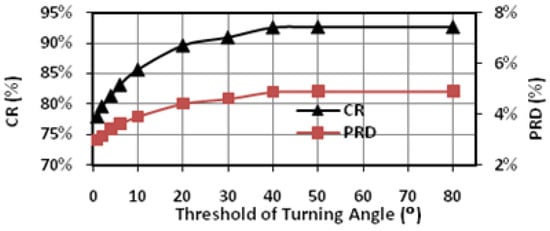 Figure 9 shows the impact of the angle threshold α on the CR and PRD. In this case, we set the window size N to 10. The angle detection is triggered when there are more than 8 points having the increments with the same direction in either the backward or the forward 10-point window. This actually determines the lower bound of CR, because the detection window will limit the number of recorded feature points even without angle detection. As the angle threshold is increased from 0° to 50°, the CR increases from 78% to 93% and the PRD increases from 3% to around 5%. From 50° to 80°, the CR and PRD remain almost constant, indicating that there are very few turning angles within the range in this case. This highlights the importance of adaptive threshold tuning, which is able to adjust the CR according to the variation of signal characteristics of the input signal.