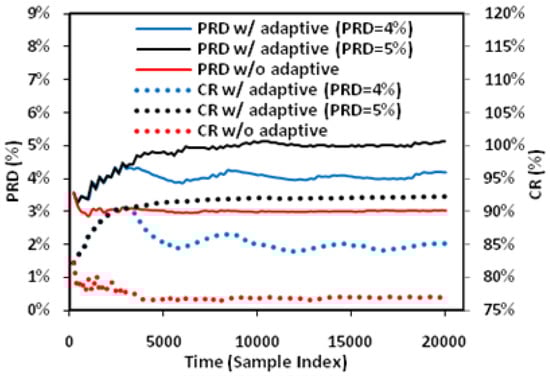 Figure 10 shows the effect of adaptive angle threshold tuning. For a fixed angle threshold of 5° without adaptive tuning, the instant PRD and CR—which are computed based on the historical samples—vary over time at the beginning and settles to around 3% and 77% after around 5000 samples. With adaptive threshold tuning, the angle threshold is automatically adjusted to force the PRD to converge to the preset target values. As a result, the maximum CR is obtained. In the two cases illustrated, the CR is increased from 77% to 86%/93% for achieving the required PRD of 4%/5%. Compared with fixed angle threshold, the proposed method is useful in dealing with variation of signal characteristics to achieve maximum CR while meeting the required signal quality.