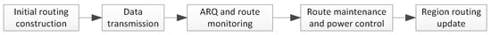 The overall design of our proposed protocol is presented in Figure 3. Firstly, an initial routing path is constructed. Here we apply receiver-side routing and the destination node is responsible for broadcasting beacon messages. The aim of initial routing construction is not only finding a reliable path to forward data to the destination node, but also including enough auxiliary nodes to assist the data transmission. The detailed design of initial routing construction is given in Section 4.2. At the beginning of data transmission, data packets are encoded with random network coding. Random network coding can ensure that the probability of sending repetitive data packets is low under the premise of lacking information exchange among relay nodes. Nodes can jointly decode messages from all neighborhood nodes. Related encoding and decoding design is given in Section 4.3. The relay nodes jointly decode messages from neighbourhood nodes and determine whether current routing path need to be updated or not. The transmit power is allocated according to the channel condition among nodes. When the transmit power is decreased to zero or increased beyond a predetermined threshold, nodes need to update the routing paths. In order to reduce the effect of partial adverse channel problems to the overall path, we only update the paths near the nodes which have adverse channel problems. This scheme can complete routing update in a short time and have less effect on the overall routing paths. Routing update and maintenance are described in Section 4.4.