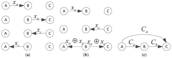(a) The conventional approach of multi-casting; (b) The network coding approach of bi-direction transmission; (c) The network coding approach for unidirectional transmissions.