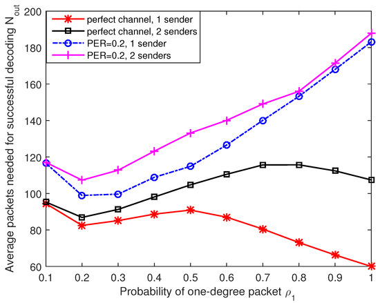 In this part, we discuss the effects of different degree distributions and present a rough optimal degree distribution for our design based on the simulation results. Firstly, we discuss the effects of one-degree packets. The channel models here are considered to be a perfect channel (PER = 0) and an erasure channel (PER = 0.2), respectively. The number of original data packets is set to 60 and we calculate the average value of 500 trials for each test. Figure 6 presents the average number of needed output packets under different probabilities of one-degree packets distribution . Here we limit the maximum number of data packets in an output packet and then the length of code vector can be shortened to 48 bits. Without loss of generality, other degree probability distributions are set to . In addition, we define in this simulation, which is the maximum number of times that a data packet can be used in all output encoded packets. When there is only one sender under perfect channel, the average number of needed packets fluctuates smoothly with varying one-degree packet distributions. As we have discussed in Section 4.3.2, the start and continuation of decoding rely on the reception of one-degree packets. If the number of one-degree packets is not enough, the receiver needs more output packets for successful decoding. However, too many one-degree packets may lead to high probability of decoding failure because only a few output packets have overlap between each other. The decoder is inefficient as a large number of received packets have already been recovered by the receiver. This situation is extremely obvious when the channel have a certain packet error rate and is close to 1. The number of needed output packets is over three times of the original data packets in this case. As we use joint coding/decoding method, we should consider the situation when the received packets come from several independent nodes. The following assumptions are set in the next simulation: There are three nodes involved in data transmissions, one for receiver and the other two are senders. In this two senders case, each sending node sends packets to the receiver with equal probability. From Figure 6 we can see clearly that the performance of two sender case is more sensitive to the number of one-degree packets compared with one sender situation. If the output packets contain too many one-degree packets and the average degree is too low, the sender need to send much more packets so that all the original data packets are chosen at least once in the received encoded packets.