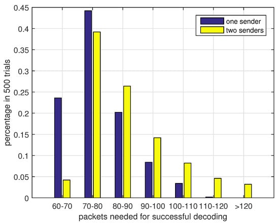 Figure 7 presents the coding efficiency (the number of original data packets/the number of encoded packets, ) of different degree distributions in one sender situation. If is close to 1, it means that the sender only needs to send a few packets for decoding messages successfully. From the results we can see that a relatively low average degree is needed to complete the decoding process. However, if the average degree is too small, data packets cannot be covered effectively and the decoding efficiency reaches a low value. The value of also affects the coding efficiency. A larger may lead to a relatively low because the nonuniform distribution level of data packets selection is higher and some data packets may only have small chances to be included in the output encoded packets. Next we discuss the performance of two sender case. In the two senders case, each sending node sends packets to the receiver with equal probability. Figure 8 presents the results under this assumption. Compared with two nodes data transmission in Figure 7, the three nodes coding scheme is a bit inefficient. This is because the two senders have a certain probability of sending duplicated packets. This probability is higher when we increase the number of low degree encoded packets. From the results we can also see that a large in case 6 can reduce the duplicated packets sending and improve the coding efficiency in the two senders case. From the Figure 7 and Figure 8 we can conclude that case 3 can work well in both scenarios and we will use case 3 in the following simulations. To further verify the effectiveness of our chosen degree distribution, we present the statistical data of case 3 in perfect channel. The results are shown in Figure 9. From this figure we can see that the decoding process can complete successfully within 100 received packets at a high probability. Although the two sender case performs worse than one sender case, the probability of over 120 encoded packets is less than 5%. So the choice of our degree distribution can satisfy our design. For practical applications, the choice of degree distribution should consider the channel condition and node density. If the channel condition is good and few nodes can be used for auxiliary transmission, we prefer low average degree distribution and vice versa.