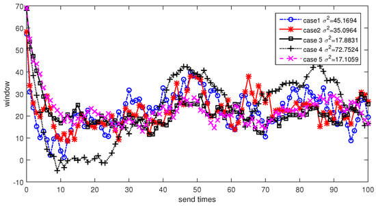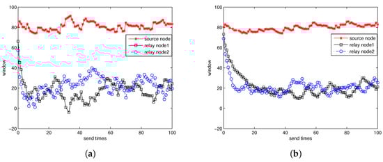 Here are from Equation (9). Figure 10 shows the window size estimation curve for case 1 and case 3. From the figure we can see that NCRP can obtain the redundant information and complete convergence in a short period of time. However, different nodes may converge to different values. For the source node, it need to send about 80 packets to relay node 1 for successful decoding. This is because there is a certain packet loss rate in the underwater channel and the source node is the only sender for relay node 1. For other nodes, we do not need to send so many packets any more because a large proportion of packets have already been sent by the previous nodes and the receivers only need a few supplementary packets for successful decoding. So the relay nodes only need to send about 20 packets which is much less than that sent by the source node. Figure 10a shows the window estimation curve for case 1 and we can see clearly that the window size estimation can complete convergence very fast (within 10 sending times). However, the value fluctuates fiercely. In addition, Figure 10b shows that the parameter settings of case 3 may extend the time for convergence but the curve seems much more stable than that of case 1.