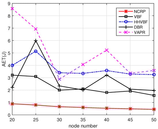 Figure 14 shows the performance in different scenarios. As the power for transmitting data is much larger than that of receiving data, the redundant transmissions will increase the power consumption significantly. For the other four protocols, the sending nodes need to broadcast data packets to their neighborhood nodes and the receiving nodes with high priorities will forward the received packets first. The forwarding procedure in low priority nodes would be suppressed if duplicated packets are received. However, repetitive data transmissions still exist and the reasons are listed as follows: (1) The neighborhood nodes may be too far away to hear each other. (2) The packets sent by high priority nodes are not able to reach their neighborhood nodes due to the high PER in UWSNs. (3) Nodes cannot receive the suppressed information in their waiting time as their priorities are too close. Except for repetitive data transmission, these four protocols cannot use the packets received from unstable link effectively. Compared with other protocols, NCRP does not limit the maximum transmission range for one hop. Nodes can jointly decode messages with packets received from different sending nodes. Meanwhile, the transmission power is optimized as we adopt loop filter and feedbacks in our design. Last but not the least, the inefficient nodes in the routes can be replaced timely and this can reduce the unnecessary energy consumption. So NCRP outperforms other protocols significantly in terms of average energy consumption and prolong the network lifetime. In the 50 nodes scenario, the of NCRP is only about 28% and even 12.3% than that of VBF and VARP.