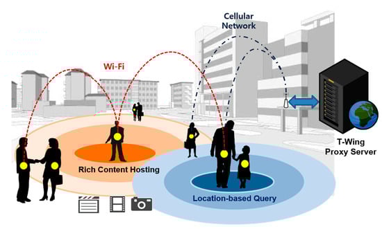 An alternative is for mobile platforms to transfer their content (along with their location) to a server on the Internet using the cellular network interface like Microblogs []. Although this approach is promising, it suffers from three problems when serving large content. First, the cellular uplink bandwidth is a severe constraint for mobile platforms in comparison to downlink bandwidth even in 4G (LTE) networks []. If several mobile platforms serve content using the same uplink connection, the experience when browsing mobile content will further degrade. Second, the battery power of mobile platforms is limited, and the cellular network interface causes significant energy drain when it is active [,]. It has been shown to have much lower bits/Joule than Wi-Fi. Although the actual power consumption may be changed in accordance with the usage of a specific network technology, the difference in energy efficiency among the heterogeneous network technologies makes this work more useful [,,]. Finally, users of mobile platforms may pay for cellular data usage on a pay-as-you-go pricing model. Nowadays, despite the ever-increasing need of people for staying ‘connected’ at any time and everywhere, in many areas of the world data connection is extremely expensive []. Therefore, users will get charged for uploading their content, as well as downloading content from other object or people, thereby reducing the incentive to host content.