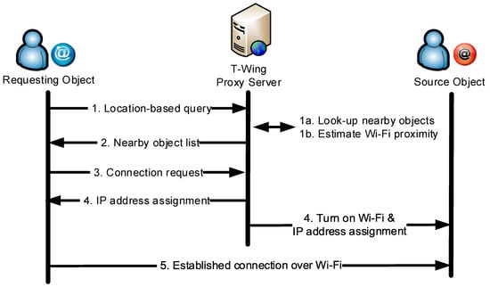 After the Wi-Fi radios are turned on, the next step is for mobile devices to connect to the appropriate BSSID (Basic Service Set Identifier), get an IP address and learn the IP address of the other mobile device. In our current implementation, mobile devices of T-Wing are equipped with N150 micro wireless adapter [] as a Wi-Fi network module which works in IEEE 802.11n. The Wi-Fi network modules of T-Wing are configured for ad-hoc mode to communicate with nearby other T-Wing devices. All mobile devices participating in T-Wing are configured to use the same channel number. After the mobile devices get connected to the appropriate BSSID, they are assigned a non-conflicting IP address by the proxy server, which thus takes on the role of a kind of DHCP (Dynamic Host Configuration Protocol) server. We note that the mobile devices cannot use a real DHCP server, since this is a peer-to-peer network. Also, it would be highly inefficient to use autoconfig to assign themselves a non-conflicting link-local IP address since autoconfig takes 10 s of seconds to send an ARP request and avoid conflicts. Finally, we note that simply selecting IP addresses at random is insufficient with IPv4. IPv6 would be the perfect solution for this problem: it has a very large number 238 of available link-local addresses. Specifically, due to the Birthday Paradox, there is a high likelihood of an IP address conflict even with relatively few neighbors in proximity. When the proxy server notifies the mobile device to wake up, the mobile device is assigned a link-local IP address. This address is only valid for the current network association between a mobile device requesting the content and a mobile device hosting the content, i.e., until the Wi-Fi connection is turned off. Similarly, the mobile device requesting the content is also assigned an IP address by the proxy server, and the proxy server informs the requestor of the IP address of the mobile device hosting the content. At this point, the mobile device can access the hosted content over IP from the nearby mobile devices.