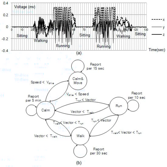 (a) The raw accelerometer readings along the three axes for sitting, walking, and running, (b) State diagram for duty-cycle scheduling.
