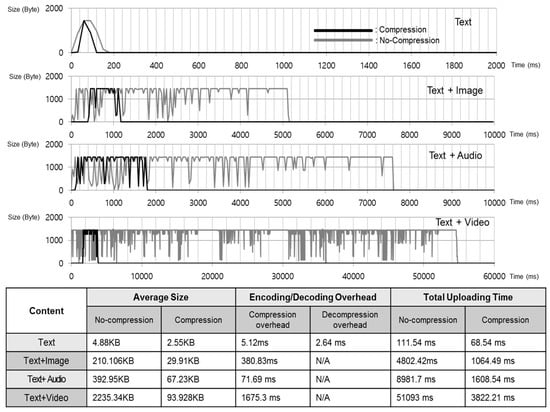 In our experiment, we transferred our benchmark files through the cellular data network for each scenario. We then measured the improvement in transfer performance enabled by the compression strategy described in Table 1. Since the cellular uplink bandwidth is a severe constraint for mobile platforms, the total uploading time is much faster compared to the original file even when compression/decompression overhead is included. On average, we found that performance is improved by 4× for the content we measured.