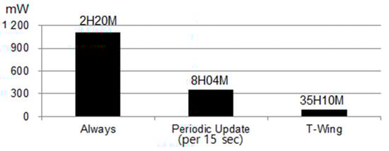To quantify the energy savings achieved by the adaptive location-reporting algorithm described in Section 4, we first measured the battery life time of the embedded platform described in Section 7.1. We fully charged the battery (2850 mAh) of the mobile platform and then measured the battery life time for each case (report per 15 s, adaptive report, no report) as described in Figure 3a. We assumed that 90 percent of personal life cycle is in the “Calm State”, while the remainder is in “Run State” or “Walk State”, 2 and 8 percent, respectively []. For the measurements of the energy saving effect by the adaptive location-reporting algorithm, the battery life time was measured with turning the Wi-Fi interface and process of web provider off. As shown in Figure 7, our results show that using our adaptive location update protocol, users can greatly increase the total usage lifetime of T-Wing.