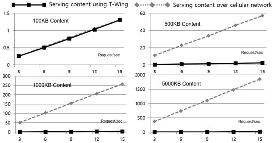 - Response Time: We compare the response time of T-Wing when serving requests compared to an alternative implementation in which the web content is hosted in the cloud, and downloaded using the cellular network. Figure 10 illustrates the response time when varying the number of concurrent requests per second. There is not much difference when the content is small. However, the time to download content over cellular networks is significantly more for larger sized content.