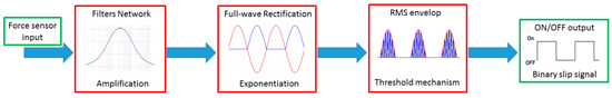 The proposed method consists of three main blocks in cascade between the input signal, which is the raw voltage output of the employed force sensor, and the ON/OFF output, which is the final slippage signal. Figure 1 shows the blocks. Although the calibrated force information is not used as input, it should be noticed that the algorithm output somehow depends from the applied pressure level, i.e., the higher the exerted pressure on the sensor is, the higher the amplitude of the signal available for the ON/OFF signal generation is. However, the applied pressure is directly proportional to the raw voltage, allowing to exploit the latter without loss of information.
