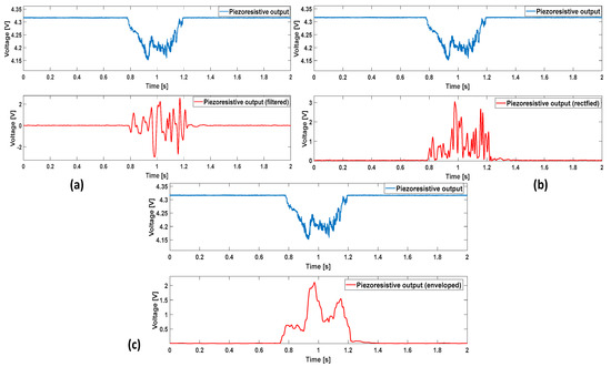 Operations of the algorithm blocks: (a) example of voltage signal from a force sensor (top) with the corresponding filtered signal (bottom); (b) same signal as in (a) (top) with the filtered and rectified signal (bottom); (c) original voltage signal (top) and enveloped one (bottom). The signal on top in (a–c) was obtained by pressing and rubbing the sensor onto an unknown roughness surface. The filters were dimensioned as reported in this section.
