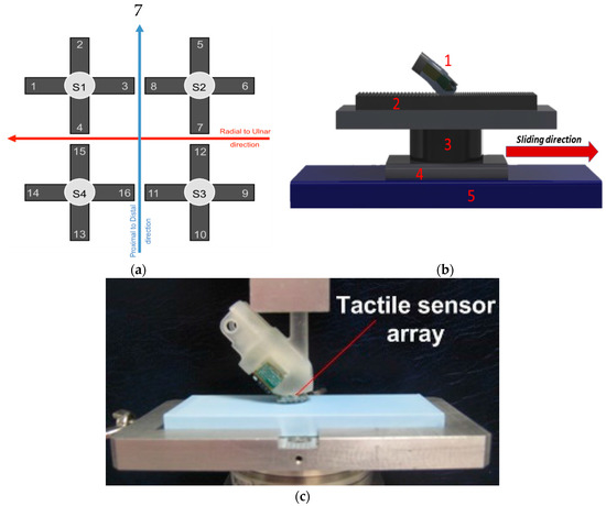 (a) Positioning of the 16 tactile units in the fingertip; (b) CAD image of the experimental setup. Fingertip embedding the sensing units (1), plastic plate (stimulus) (2), voice coil actuator providing interaction force (3) and support (4) moved on a linear guide (5) by a DC motor; (c) real picture of the experimental setup.